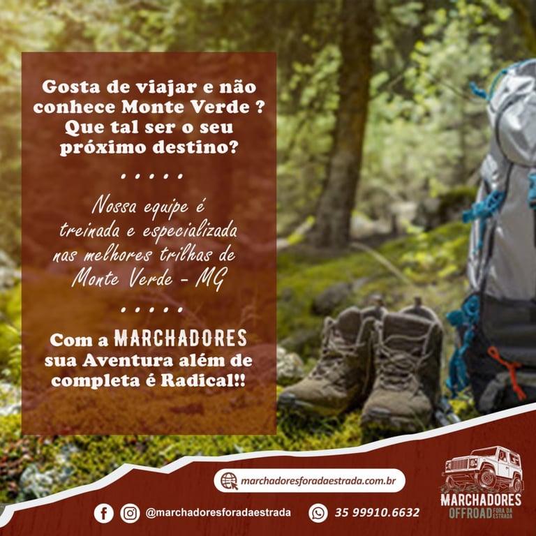 Minha esposa e eu estivemos em Monte Verde na semana de 09 a 14/07/24 e fizemos dois passeios com o Marchadores off road; eles foram a nossa melhor escolha, sem sombra de dúvidas!! A Cris e o Henrique são maravilhosos, atenciosos, divertidos... Explicam tudo com muito entusiasmo, dão dicas preciosas! Visitamos a escola de falcoaria, fizemos a trilha da pedra redonda seguida de city tour, tudo lindo e valeu ainda mais a pena pela condução deles! Ah! Eles também fazem excelentes fotos e vídeos!